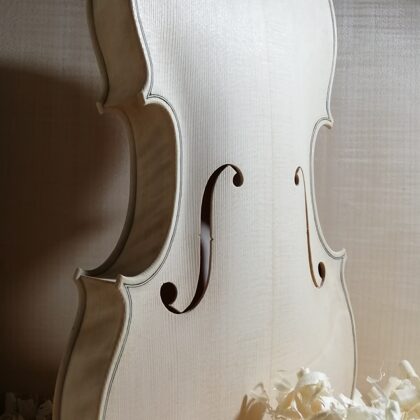 Viola de 41 cm (16 pulgadas y 1/16), modelo Juliet Barker. Construida con madera de chopo para los aros y el fondo, arce para la voluta y abeto para la tapa. Barnizada al aceite. VENDIDA